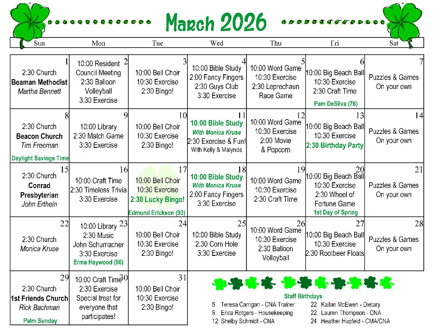 Follow our schedule to know what the Oakview residents will be doing throughout the month!